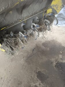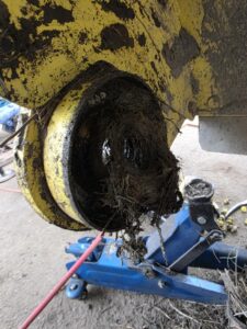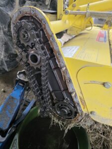 草の巻付きが原因でチェーンケースの軸のスナップリングが飛びチェーンが外れチェーンケースカバーに穴が空き使用不可になりました。